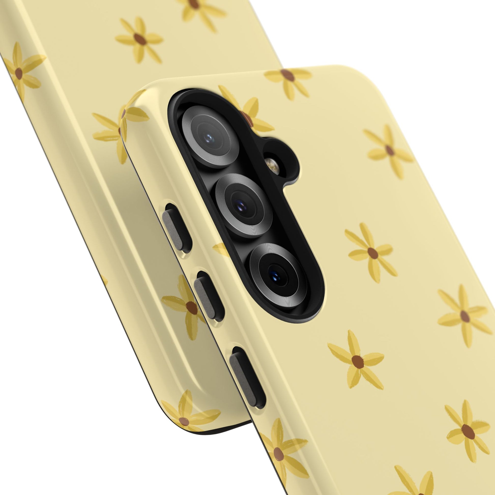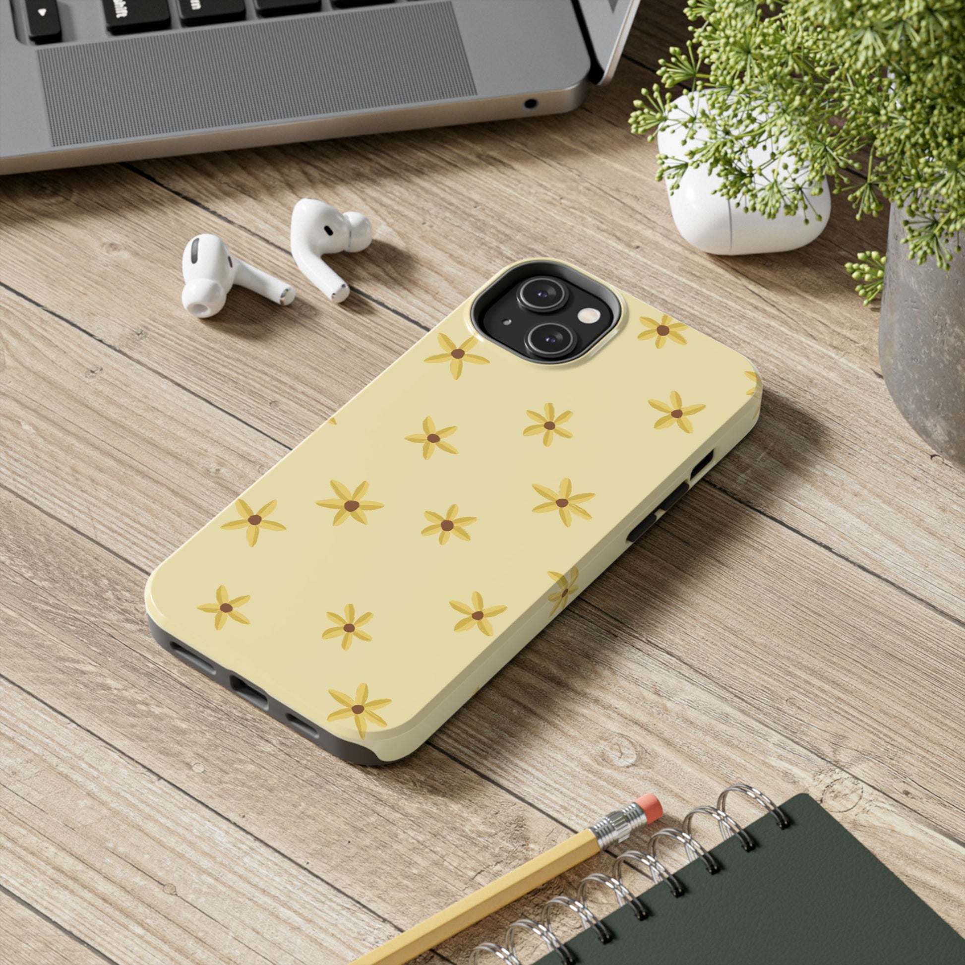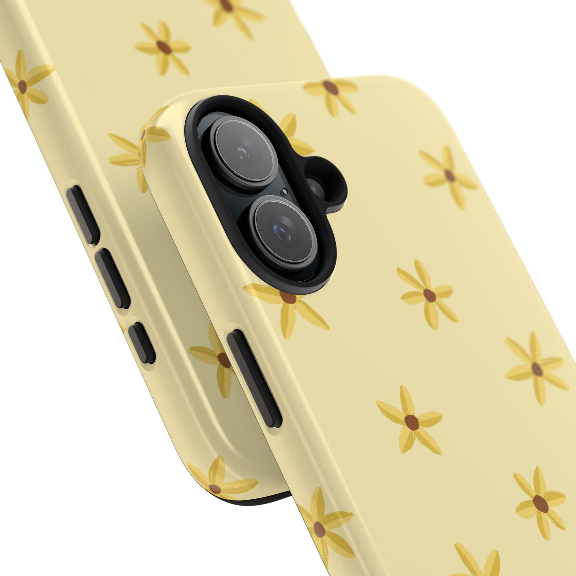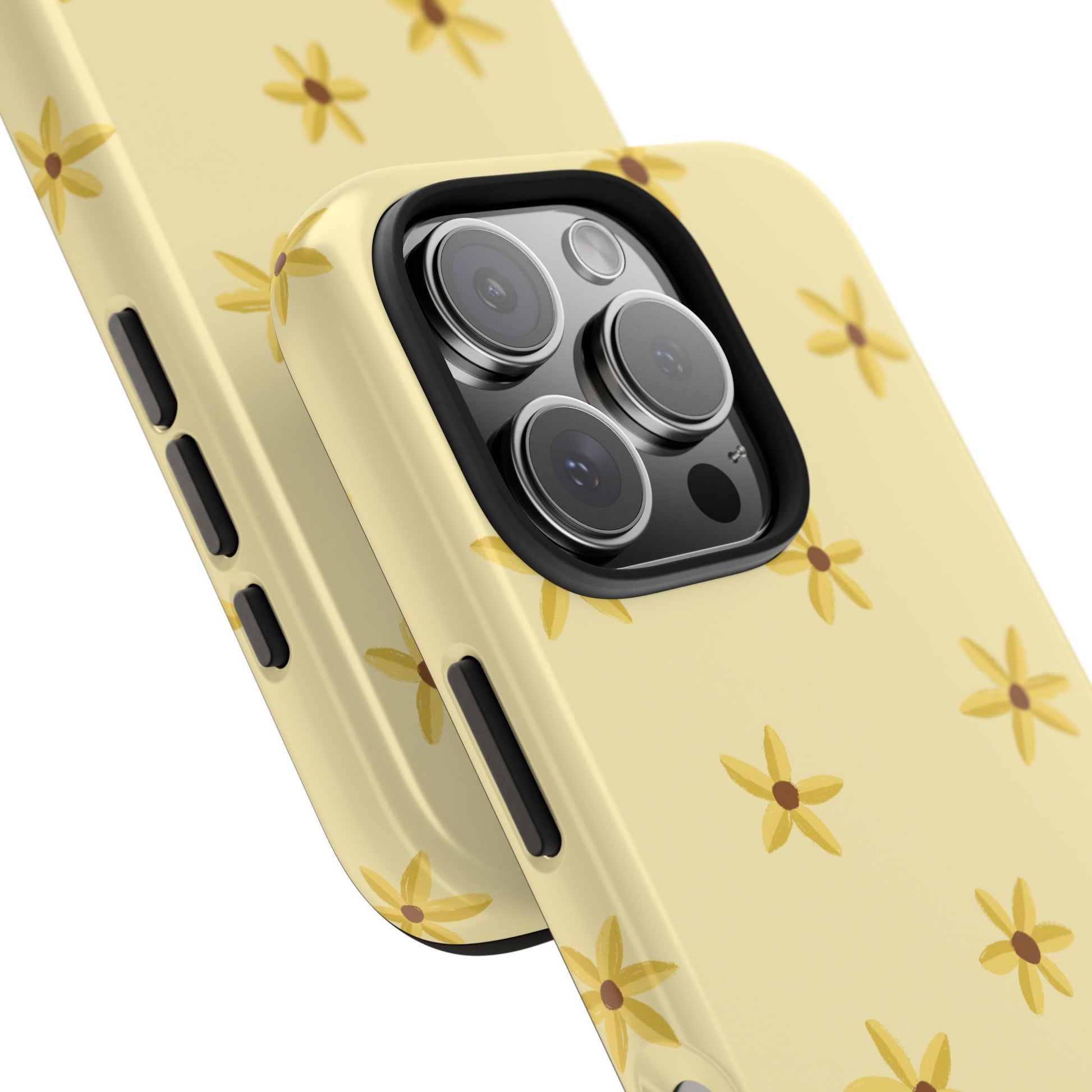A cheerful, protective phone case that brings a soft, sunny mood to everyday carry. The glossy pale-yellow shell is scattered with small, hand-drawn floral motifs that feel casual and friendly. Inside, a flexible TPU liner cushions drops while the rigid polycarbonate outer shell resists impacts and outdoor wear. The raised bezel helps keep the screen safe when placed face-down, and the two-piece construction disperses shock so your phone stays intact through daily bumps. Lightweight and slim enough for pockets, it supports wireless charging and now fits the latest iPhone 17 models.