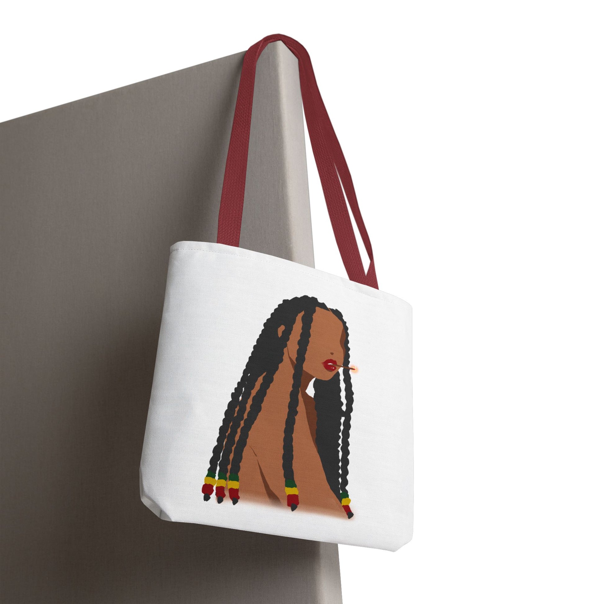 Light, bold, and unapologetically proud — this printed tote brings a warm, personal vibe to everyday life. The front shows an elegant silhouette of a Black woman with long, beaded braids and confident red lips; the reverse carries a simple heart above the phrase “Black Women” in playful, rounded lettering. Wear it to carry books, market finds, or art supplies and let it speak for you: quiet strength, bright style, and cultural celebration woven into a reliable everyday bag. The roomy boxed corners and reinforced handles mean it moves easily from neighborhood walks to community events, while the clean white background keeps the artwork crisp and striking.